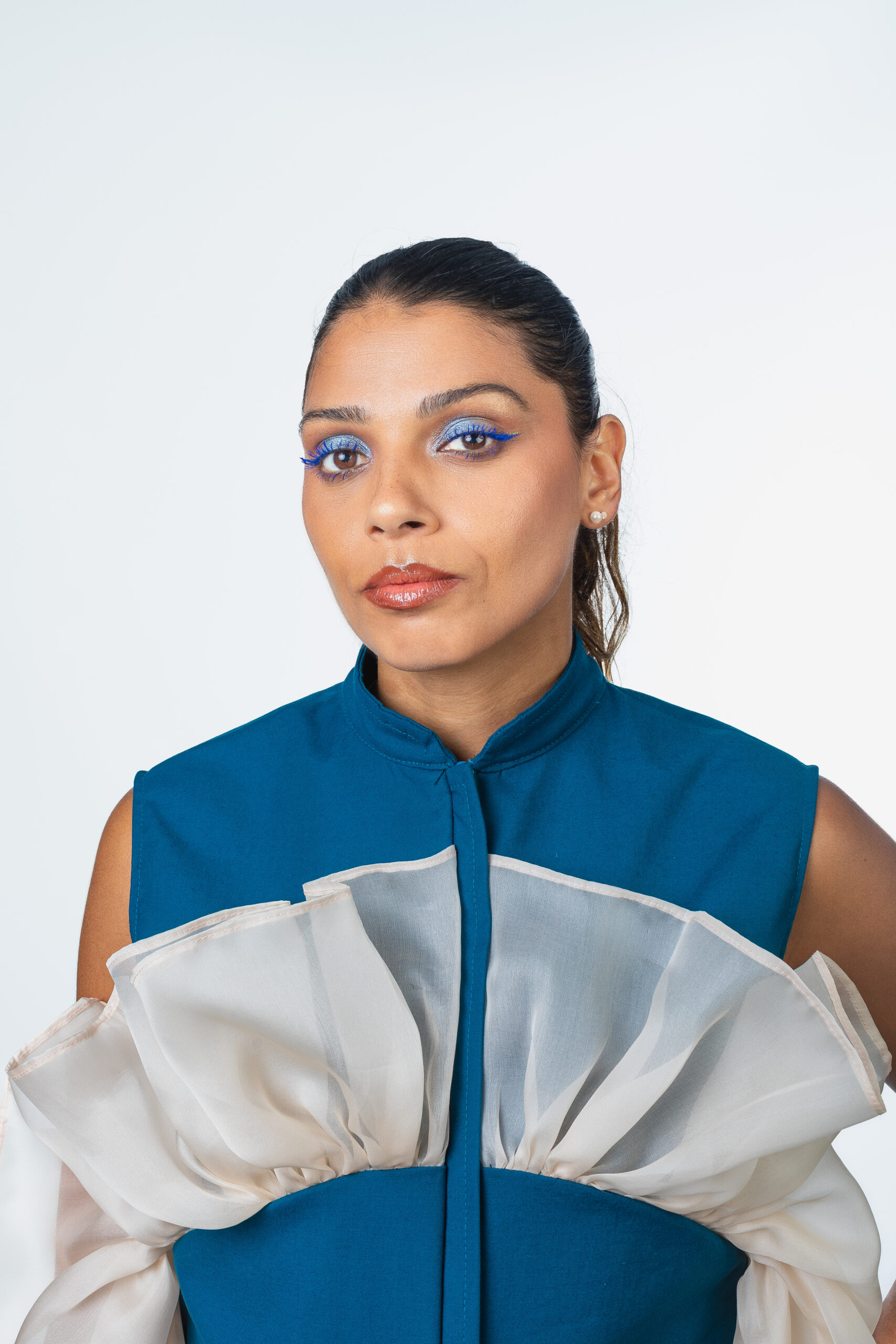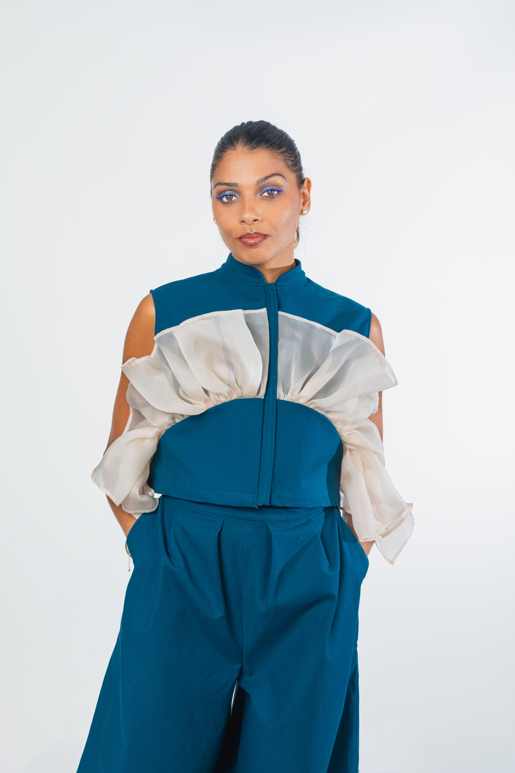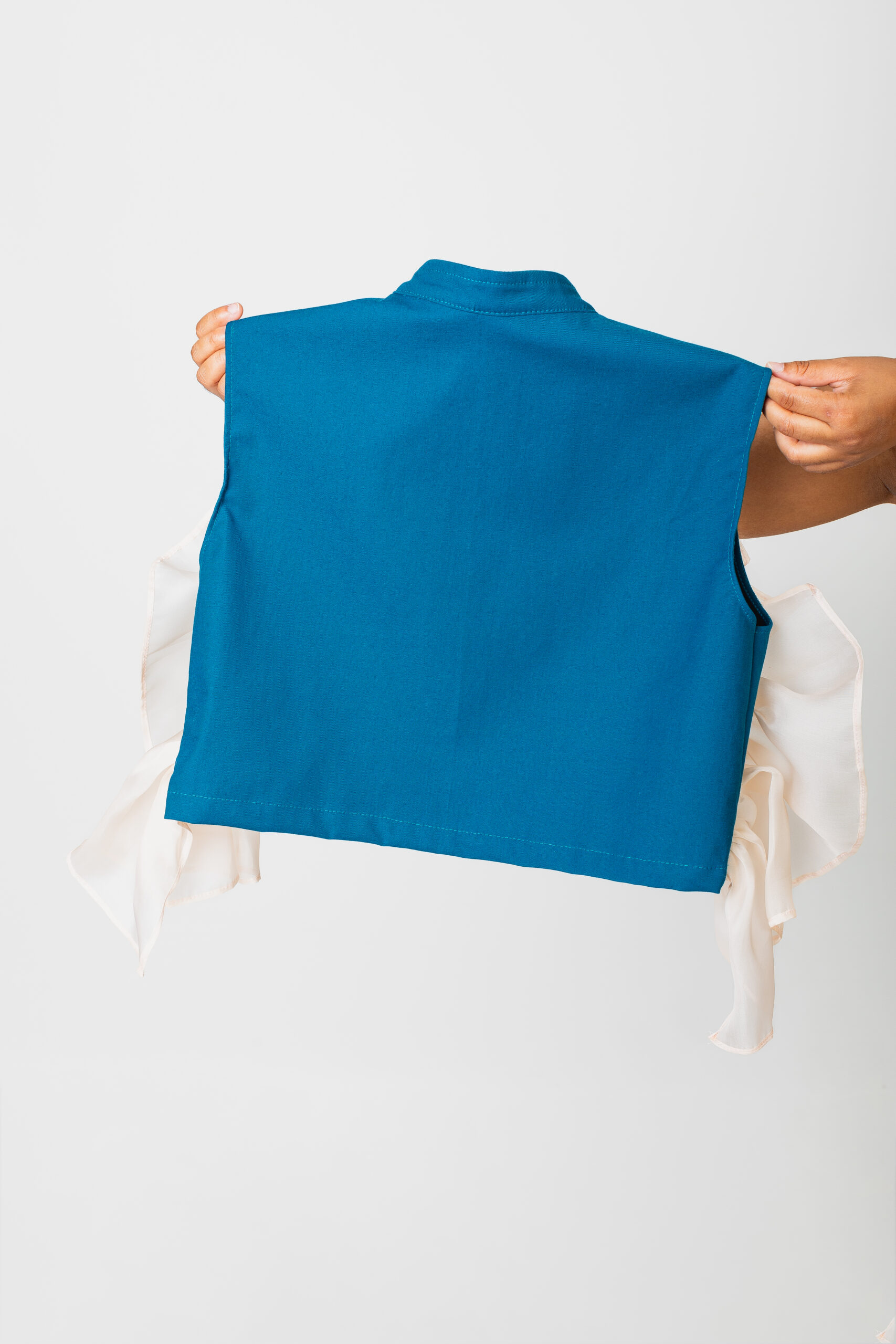 - Haut sans manches à col maho, avec une découpe pour le volant au niveau de la poitrine