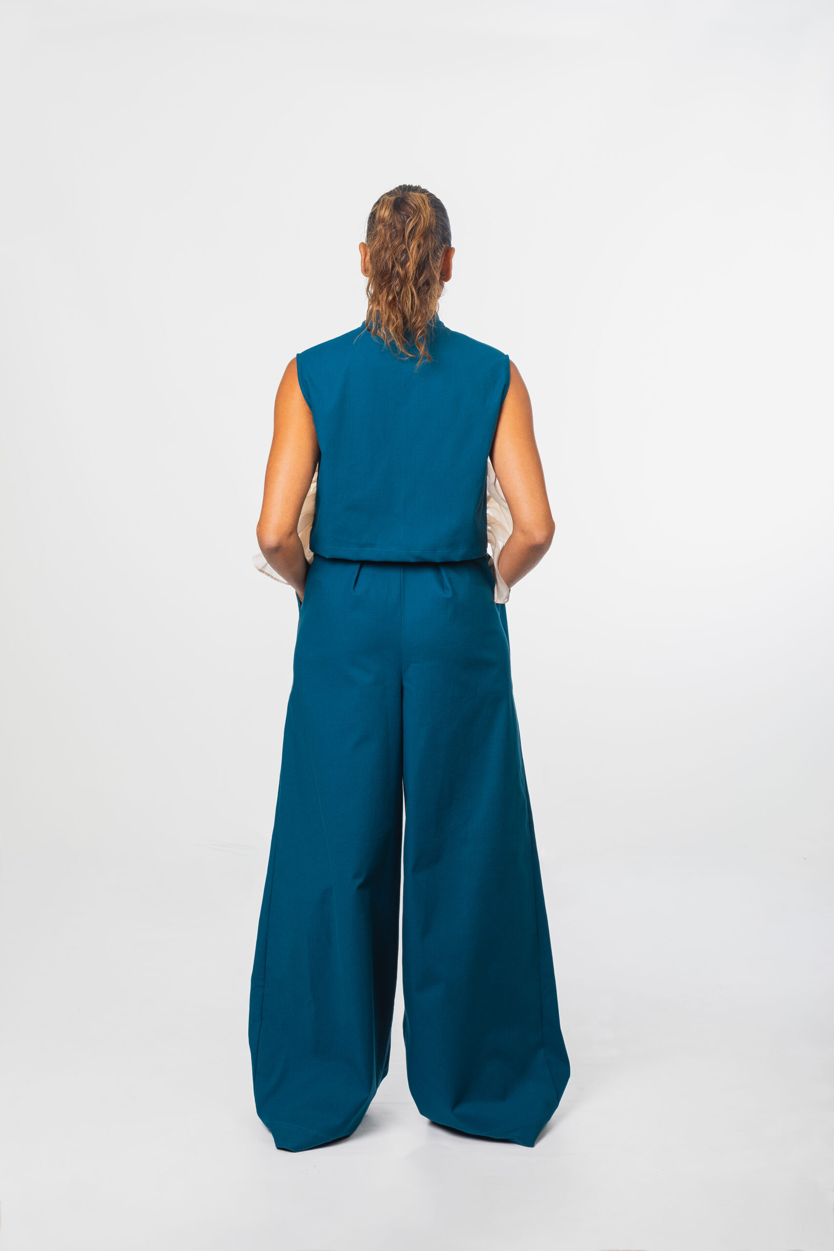 - Pantalon droite avec poche, taille haute avec deux plis de chaque côté. Inspiré du pantalon style "palazzo"